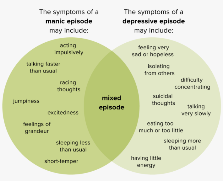 Bipolar disorder is a complex and severe psychiatric illness, often linked to genetic, neurobiological, and psychosocial factors. Patients may experience depressive symptoms such as low mood, lack of interest, anhedonia, self-blame, and suicidal thoughts and behaviors. They may also experience manic symptoms such as elevated mood, racing thoughts, increased volition and behavior, increased energy, and decreased sleep requirements.